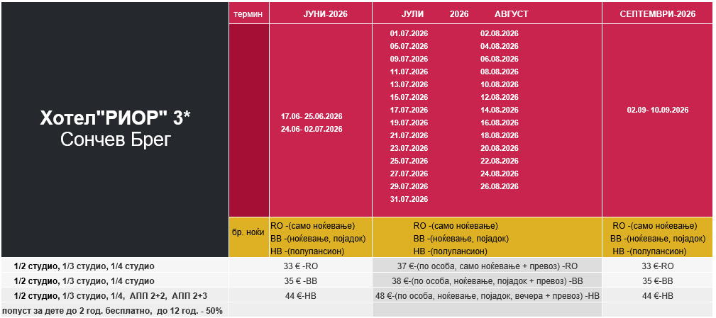 Хотел “Риор” 3* се наоѓа во централниот дел на Сончев Брег, на 100 м.од Хотел Кубан и 300 м.од плажа. Хотелот (комплексот) располага со 1/2, 1/3, 2+2 студиа, АПП 1/4 , 1/5 со мини кујни, биро, телевизор со сателитска програма, мини бар, телефон, wc, бања, фрижидер, бесплатна клима, интернет (wi-fi), балкон со масичка и столчиња, мал базен со бесплатни лежалки. Во самиот хотел има сопствен ресторан кој на гостите им нуди одлични специјалитети, за време на викенди во ресторанот нуди забава со локални групи во живо.